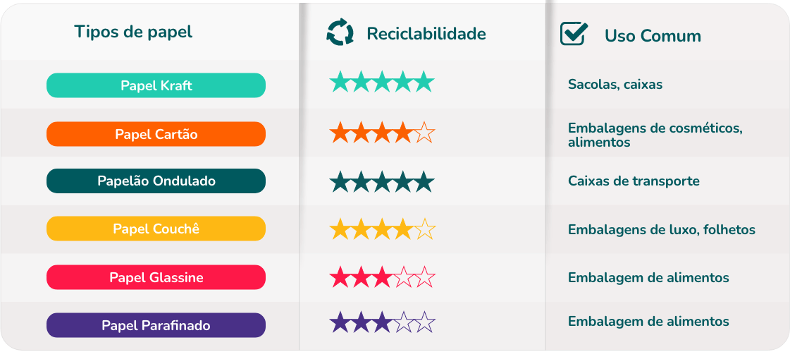 - Reciclabilidade: ★★★★☆ Papel cartão in natura é facilmente reciclado, especialmente quando não são aplicadas camadas de proteção.
